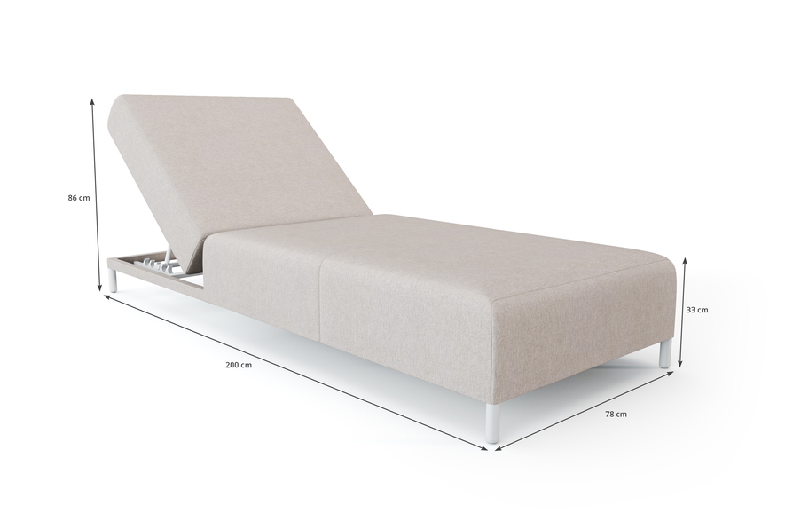 La estructura de aluminio blanco mate confiere a esta tumbona una elegancia atemporal, mientras que la tapicería en un noble beige cuarzo forma un complemento armonioso. Gracias a sus propiedades impermeables, esta obra maestra es perfecta para los días soleados y siempre ofrece una experiencia de descanso agradable, ya que el material se seca rápidamente.