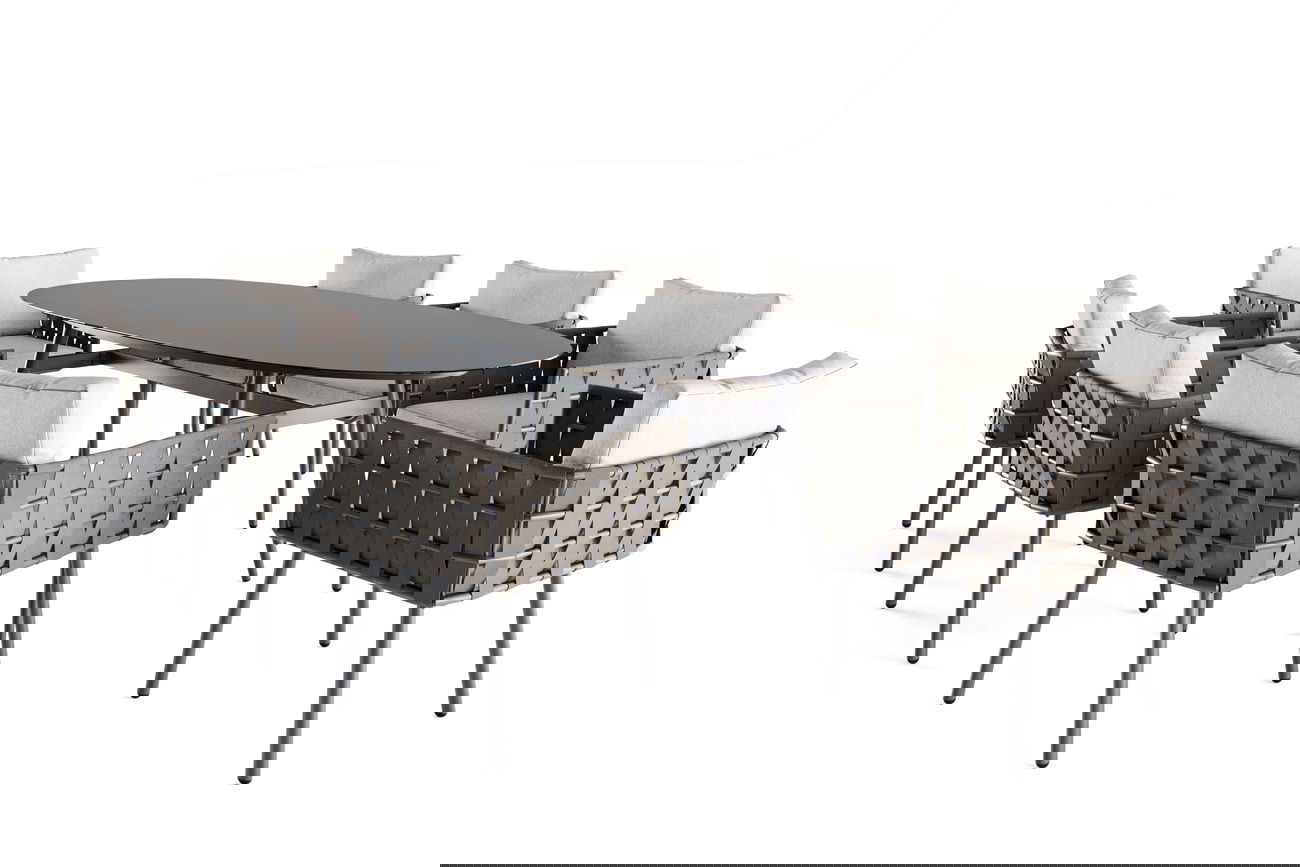 color marrón grisáceo Almohadas y cojines gran comodidad al sentarse2, Cojín con espuma de 8 cm de grosor, cojín de respaldo grueso de fibra sintética, espuma de secado rápido Peso Conjunto de salón de aprox. 40 kg Material Aluminio, Cuerda Montaje Se requiere montaje Tablero de la mesa Aluminio2, mate2, gris seda, Grosor 4 mm, Recubrimiento de polvo Contenido del envío 1x mesa, 8x sillas, Incluye cojines de asiento Sillones hasta el 8 Material exterior 100% trenzado a mano, Unicolor, teñido en masa, secado rápido, Cuerda 100% olefina, Color: gris-marrón, 50 mm de ancho Estructura Aluminio, con recubrimiento en polvo, robusto, inoxidable, resistente a la intemperie, Grosor de hasta 1,5 mm Funda Beige, 100% Olefina, Extraíble, lavable a 30°C, Fabricación resistente, Alta resistencia, Cremalleras ocultas, De un solo color, Preimpregnado, Teñido en masa características Peso máximo 120 kg por asiento, Resistente a la intemperie, Fácil de mantener SKU 23520 Instrucciones de seguridad