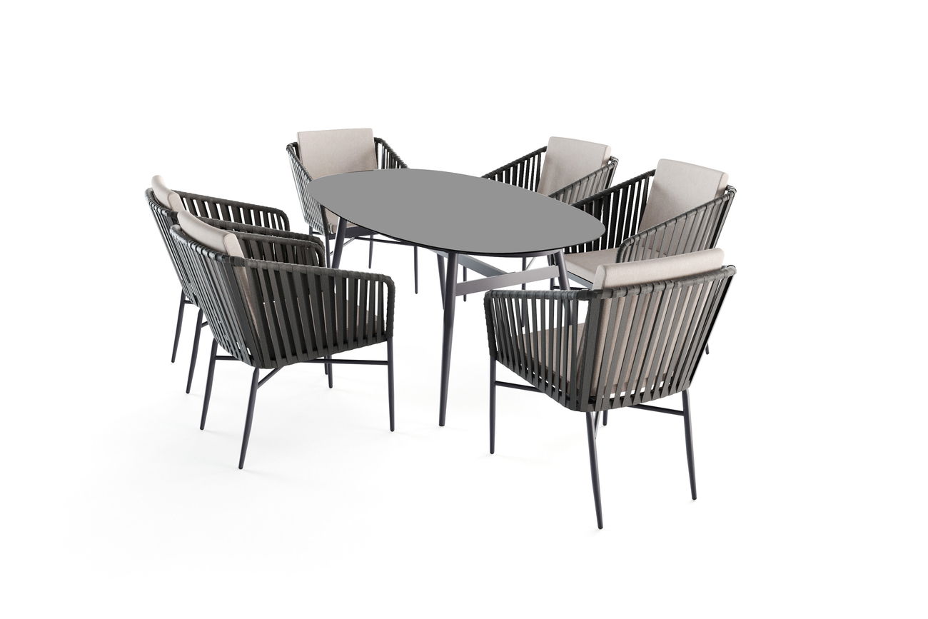 - Detalles e información del producto- características - Resistente a la intemperie, Fácil de mantener, Peso máximo hasta 110 kg por asiento - Almohadas y cojines - Cojín de asiento con espuma de 5 cm de grosor, Cojín de respaldo con espuma de 5 cm de grosor - Peso - Mesa de comedor de aprox. 35 kg, Silla de aprox. 5 kg - Material - Aluminio, Cuerda - Montaje - La mesa se entrega desmontada - Tablero de la mesa - Cristal esmerilado, Cristal de seguridad ESG, liso, antracita, mate, Grosor 5 mm - Contenido del envío - 1x mesa de comedor, 6x sillas, Incluye cojines de asiento - Sillones - hasta el 6 - Material exterior - 100% trenzado a mano, Color: antracita, Unicolor, teñido en masa, secado rápido, Cuerda 100% olefina, 20 mm de ancho - Estructura - Aluminio, con recubrimiento en polvo, robusto, inoxidable, resistente a la intemperie, Grosor de hasta 1,2 mm, Patas de mesa Ø 6 cm - Art - Conjuntos de comedor - Funda - Beige cuarzo (jaspeado), 100% Poliéster, 210 g/m², 100% Olefina, De un solo color, Teñido en masa - color - antracita - SKU - 23417