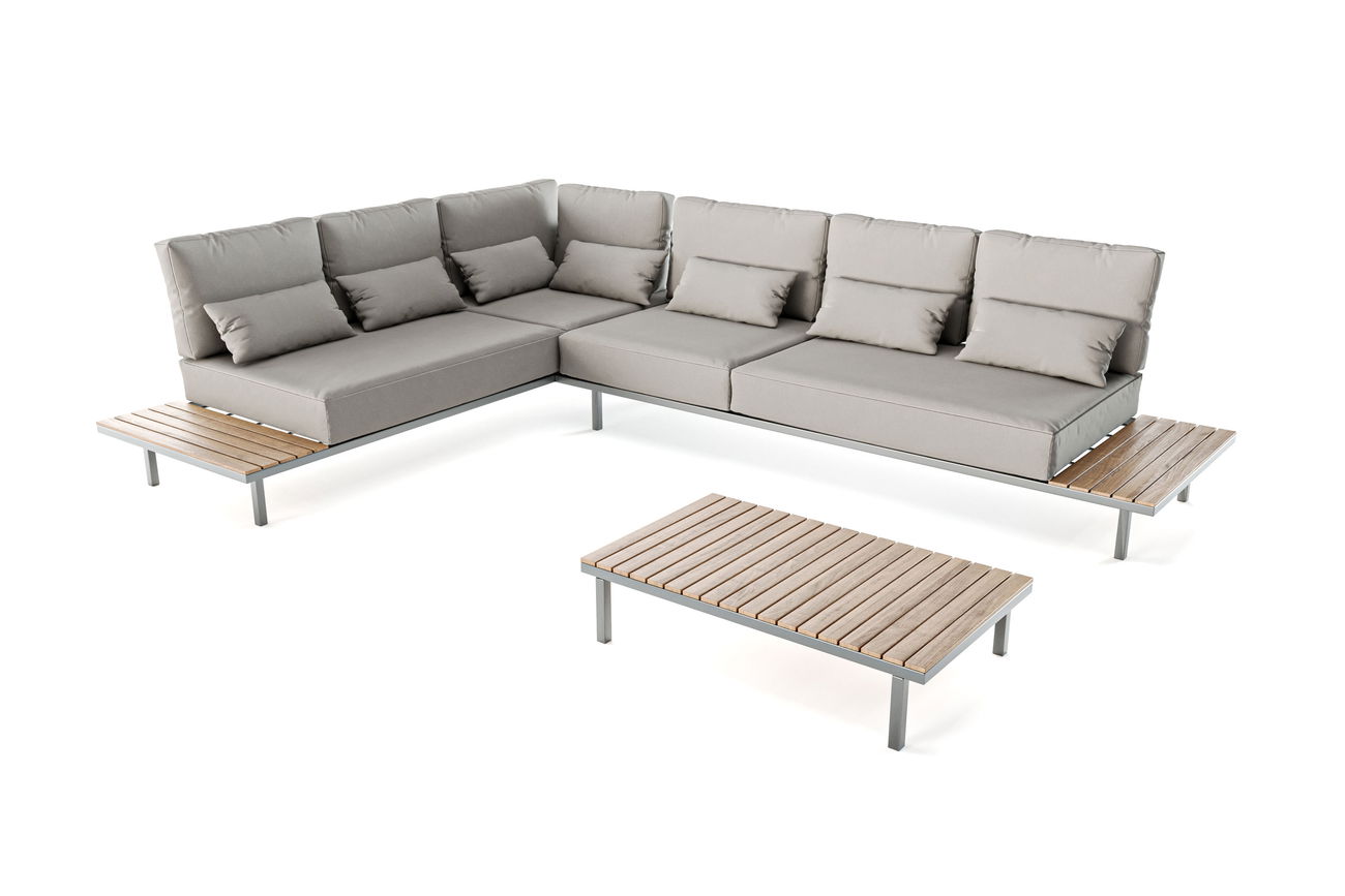 Todos los sofás de 3 plazas están equipados con una estructura resistente de acero inoxidable que garantiza durabilidad y estabilidad. En el extremo de cada sofá de 3 plazas hay una generosa superficie de almacenamiento, equipada con elegantes listones de madera de teca. Estos no solo ofrecen un espacio práctico para sus bebidas, aperitivos o su lectura favorita, sino que también aportan una estética natural y calidez al Conjunto. La mesa a juego con estructura y tablero de acero inoxidable y madera de teca completa el conjunto y ofrece un elegante punto focal para las reuniones sociales al aire libre.