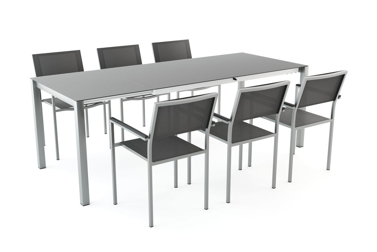 El conjunto se completa con la mesa extensible, que con su estructura de acero inoxidable de alta calidad y su elegante cristal oscuro aporta un toque de sofisticación a su terraza. Su tamaño es ajustable, extensible de 160 cm a 220 cm, lo que le ofrece flexibilidad para diferentes ocasiones y al mismo tiempo proporciona el escenario perfecto para sus experiencias culinarias al aire libre.