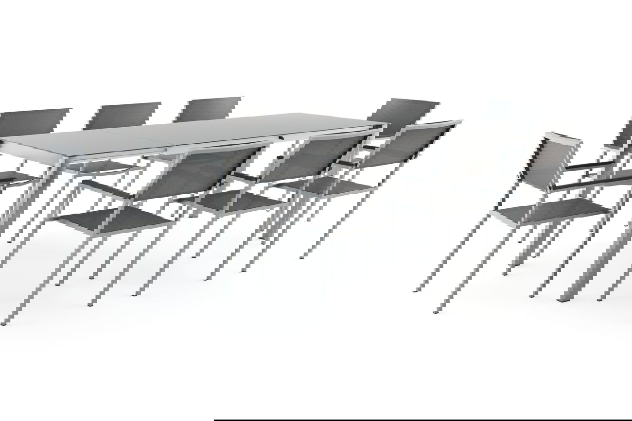El conjunto se complementa con la mesa extensible, que con su estructura de acero inoxidable de alta calidad y el elegante Cristal oscuro aporta un toque de sofisticación a su terraza. Su tamaño es ajustable, extensible de 160 cm a 220 cm, lo que le ofrece flexibilidad para diferentes ocasiones y al mismo tiempo proporciona el escenario perfecto para sus experiencias culinarias al aire libre.