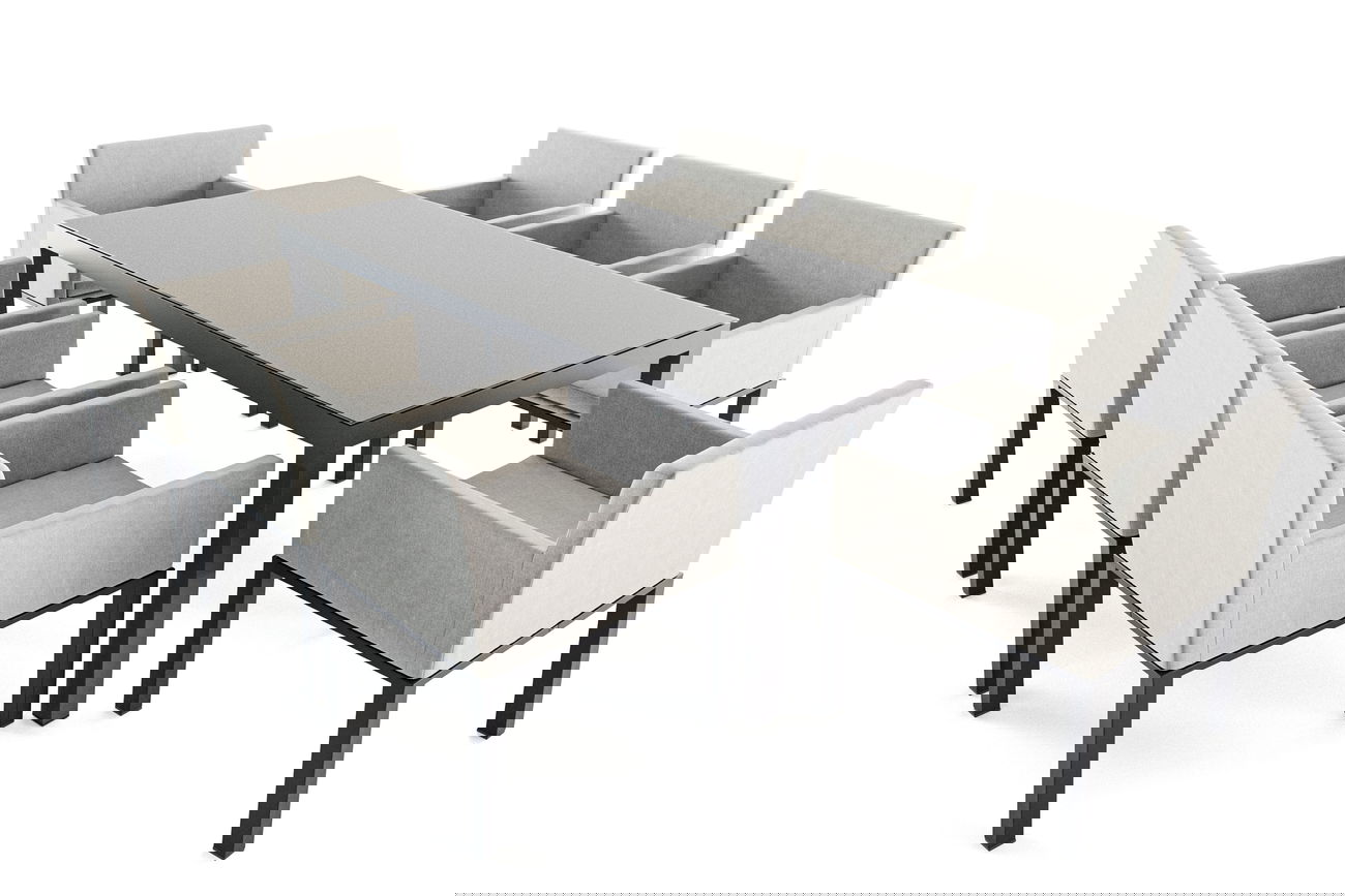 Conjunto de comedor tapizado para 8 personas en gris plateado. Disponible exclusivamente en Living Zone. Envío gratuito.