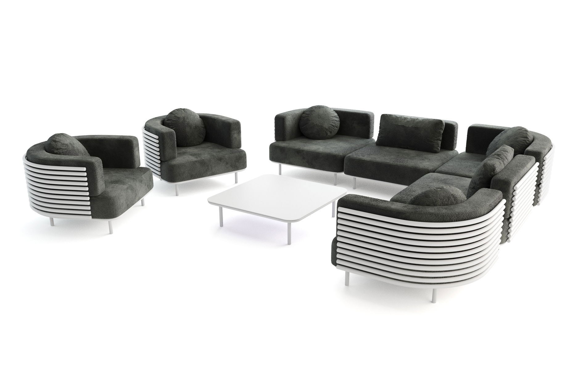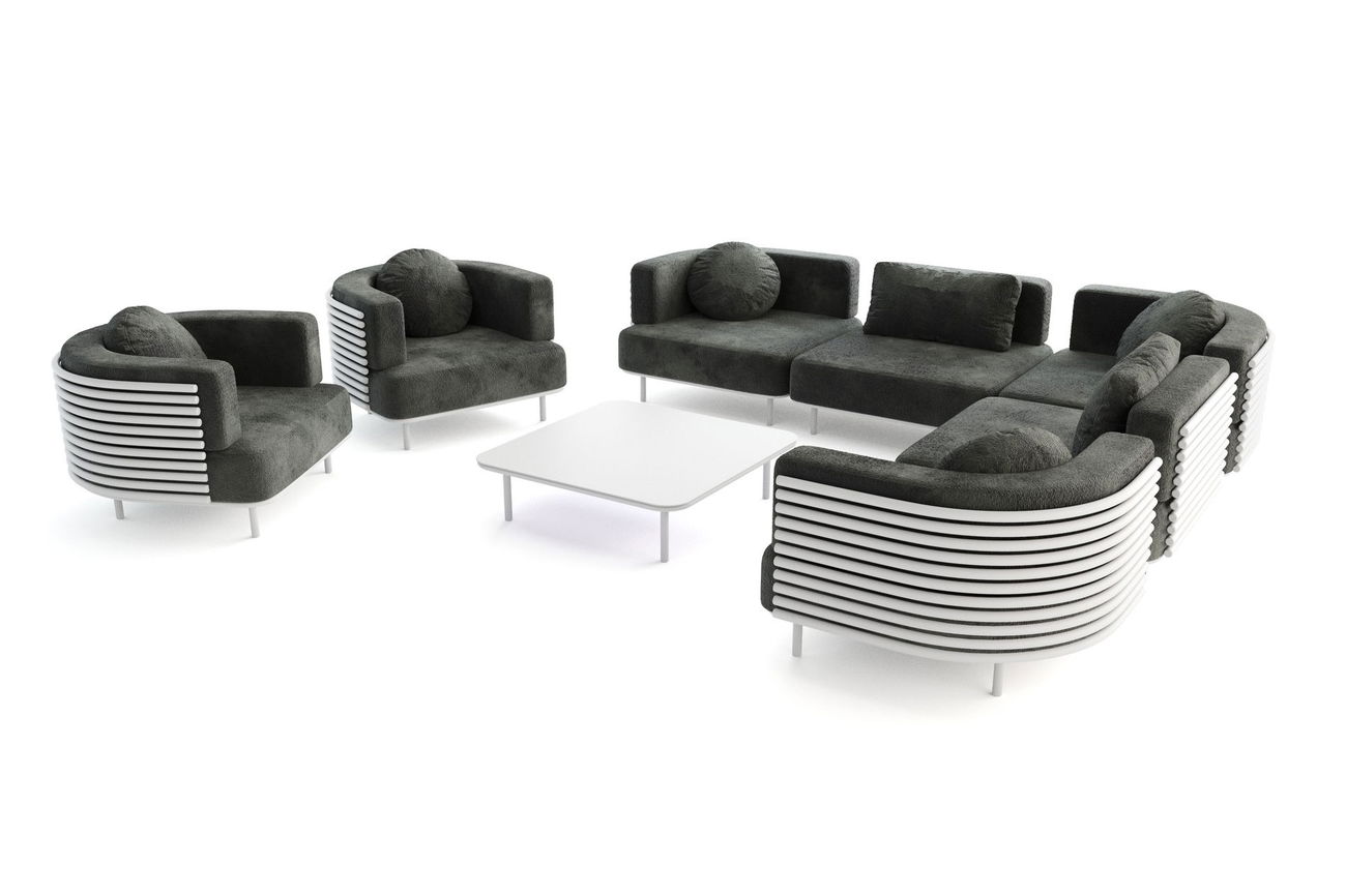 Combine el salón con la mesa de centro a juego de aluminio para complementar el Conjunto con estilo. Los sillones de posición libre se pueden organizar según sus deseos y condiciones de espacio, sin necesidad de montaje.